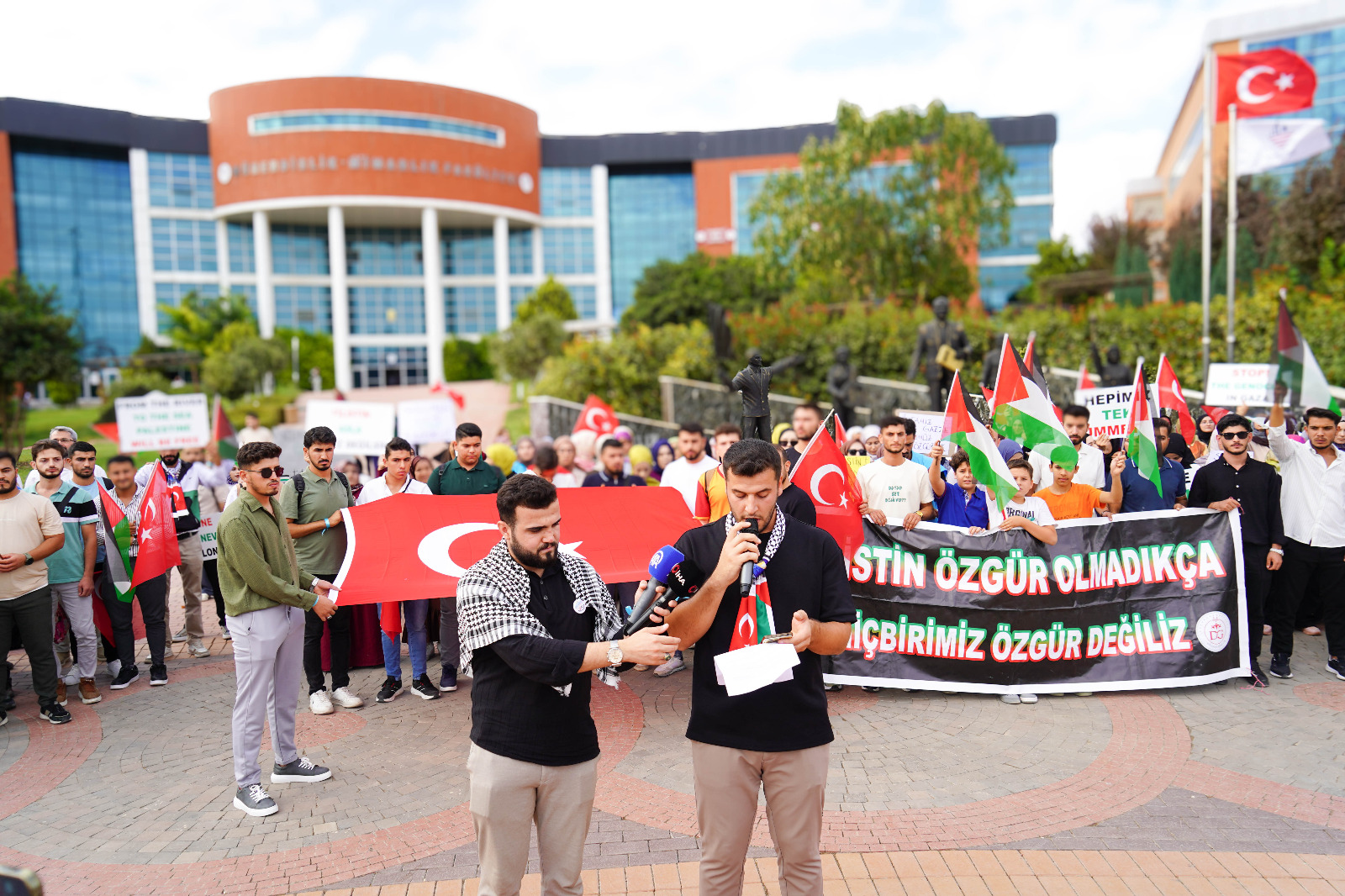 15 Temmuz Meydanı’nda yapılan basın açıklamasında, Filistin’de yaşananların yalnızca bölgesel bir sorun değil, insanlığın ortak vicdanını yaralayan bir dram olduğu vurgulandı. Açıklamada, “Bugün zulme karşı tek ses, tek yürek olma günüdür. SUMUD; zulme boyun eğmeyenlerin, adalet için ayağa kalkanların adıdır. Bizler de üniversite gençliği olarak Filistin halkının yanında olduğumuzu ilan ediyoruz. Katil İsrail hesap verecek, Filistin özgür olacaktır” ifadeleri yer aldı