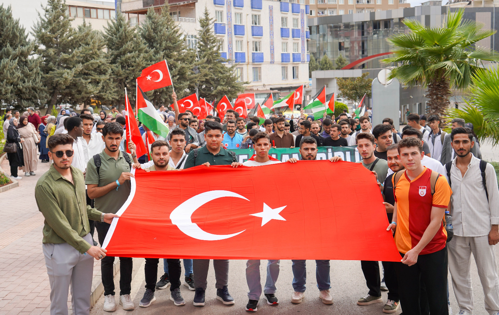 Merkez Kampüs Giriş Kapısı’ndan başlayan yürüyüş, öğrencilerin ellerinde Türk bayrakları, Filistin bayrakları ve destek pankartlarıyla 15 Temmuz Meydanı’na kadar devam etti. Katılımcılar yürüyüş boyunca Filistin’e destek sloganları attı, yaşanan zulme dikkat çekti. Öğrencilerin coşkulu katılımı, üniversite gençliğinin duyarlılığını ortaya koydu.