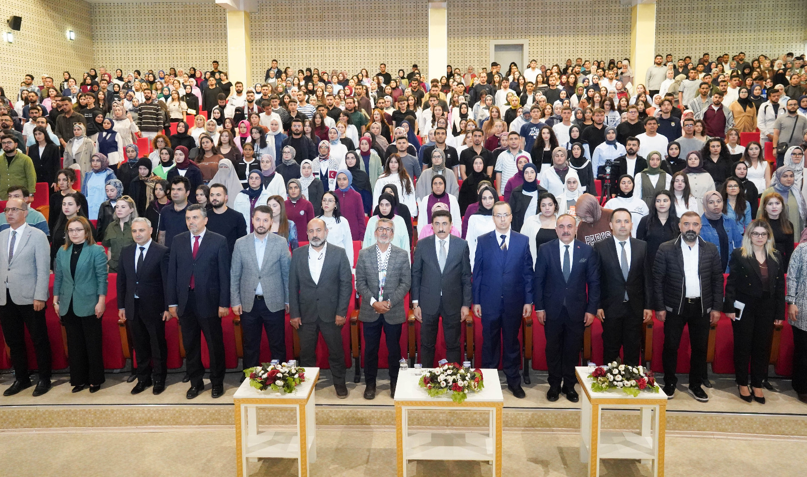 Etkinliğin açılışında konuşan Rektörümüz Prof. Dr. Zekeriya Akman, Sumud’un bir direnişten öte insan onurunu ve yaşama tutunma iradesini temsil ettiğini ifade ederek, “Bugün insanlığın ortak vicdanına, ortak umuduna ses veriyoruz. Yıkılmış şehirlerin, sessizleşmiş sokakların, gökyüzünden düşen bombaların altında bile dimdik duran bir halktan söz ediyoruz. Ve tam da bu direnişin adı: Sumud. Bu kelime, sadece direnmek değil; kök salmak, vazgeçmemek, insan kalabilmek demektir” dedi.