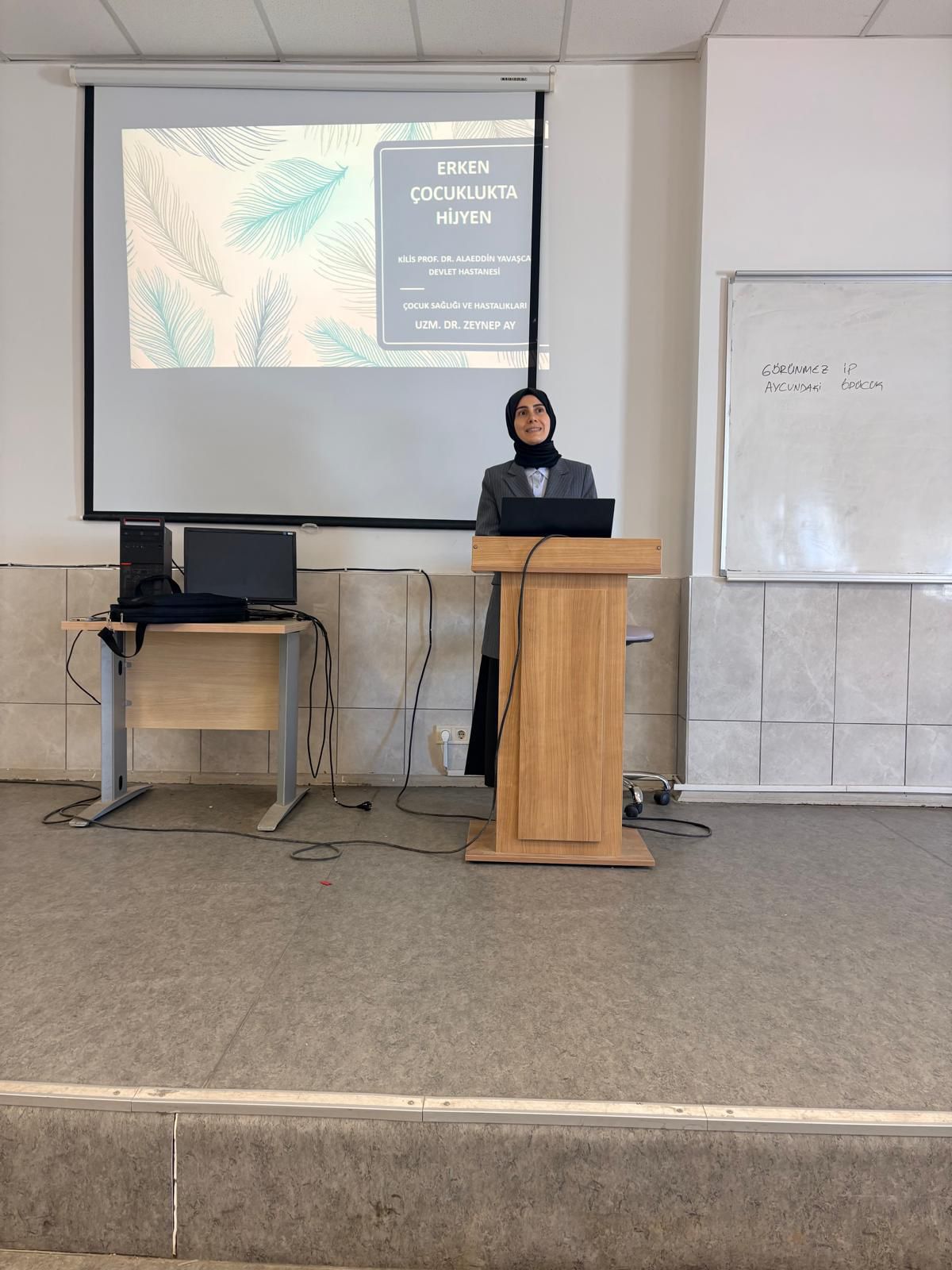 Etkinlik kapsamında, Kilis Prof. Dr. Alaeddin Yavaşca Devlet Hastanesi Çocuk Sağlığı ve Hastalıkları Uzmanı Dr. Zeynep Ay, üniversite öğrencilerine çocuk sağlığı ve hijyenin çocuk sağlığı üzerindeki olumlu etkileri hakkında önemli bilgiler aktardı.