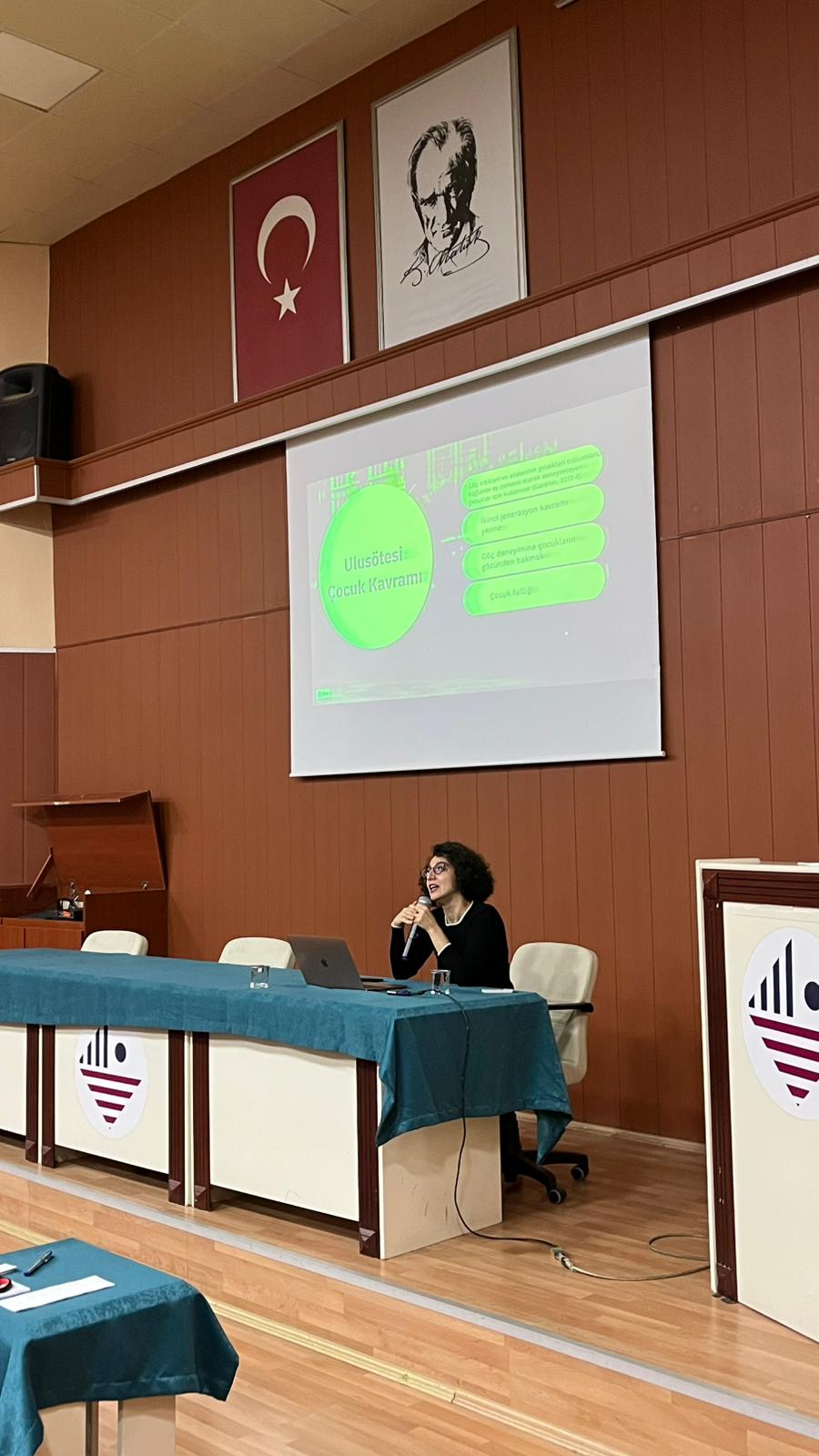 Açılış konuşmasının ardından programın sunumu, Dr. Öğr. Üyesi Nehir Gündoğdu tarafından gerçekleştirildi. Gündoğdu, sunumunda, ulusötesi göç hareketliliğinin çocuklar üzerindeki etkilerini sosyolojik bir bakış açısıyla ele aldı. Çalışmasında, göçmen çocukların yeni bir toplumsal alan içindeki konumlanmalarını, kimlik gelişimlerini, uyum süreçlerini ve göç deneyimine ilişkin duygusal tepkilerini değerlendirdi.