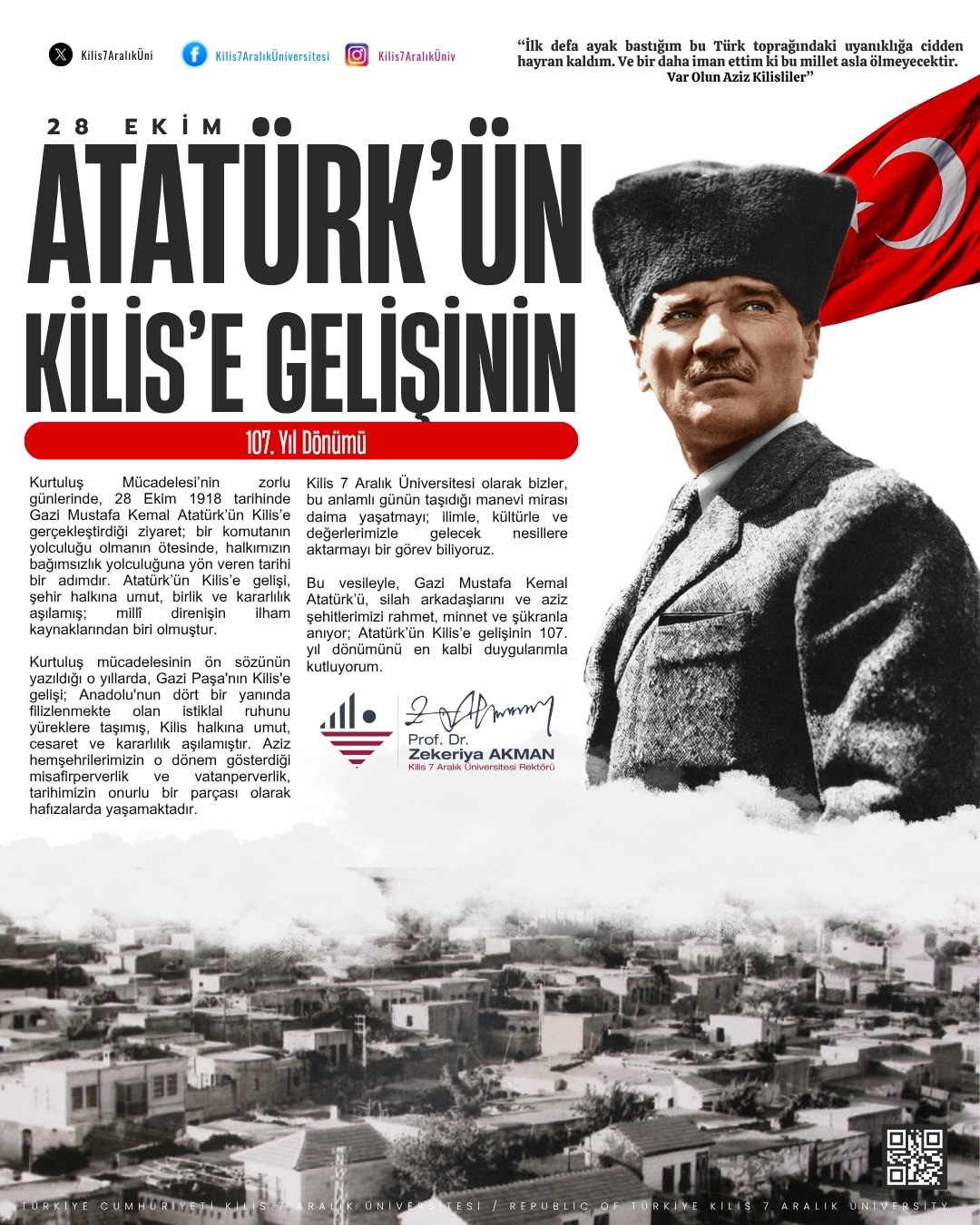 Rektörümüz Prof. Dr. Zekeriya Akman'ın, ATATÜRK'ün Kilis'e Gelişinin 107. Yıl Dönümü Kutlama Mesajı