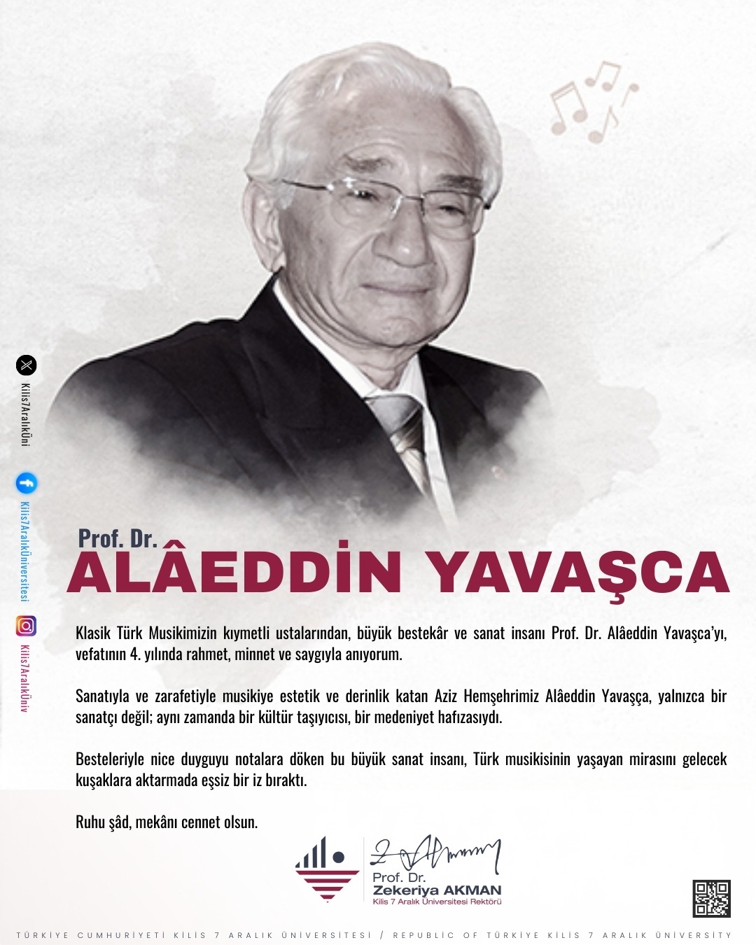 Rektörümüz Prof. Dr. Zekeriya AKMAN'ın, Büyük Bestekâr ve Sanat İnsanı Prof. Dr. Alaeddin YAVAŞCA'nın Vefat Yıl Dönümü Anma Mesajı
