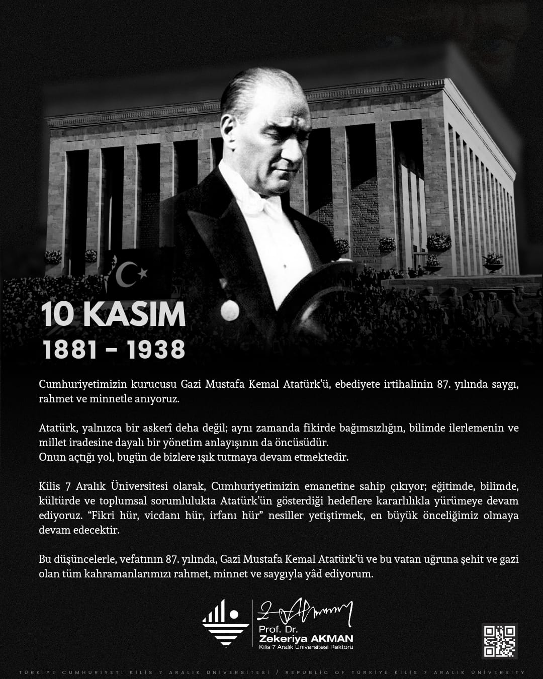 Rektörümüz Prof. Dr. Zekeriya Akman`ın, Gazi Mustafa Kemal ATATÜRK`ün Aramızdan Ayrılışının 87. Yıl Dönümü Anma Mesajı